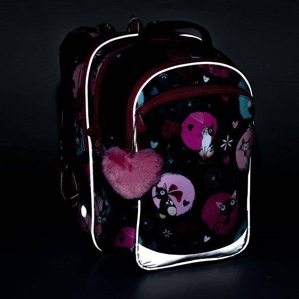 Minőségi iskolatáska alsósoknak, kék és rózsaszín kivitelben, cicás mintával. Az ergonomikus hátizsák lányoknak ajánlott, cicákkal és szívecskékkel igazán divatos. Praktikus elrendezésű, kényelmes, párnázott merevített hátlapja kíméli a gyerekek gerincét.