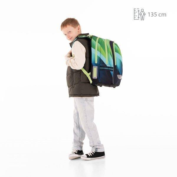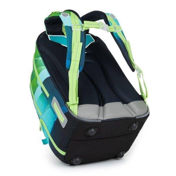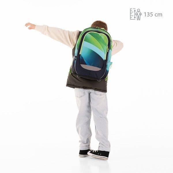 Minőségi iskolatáska fiúknak, mely a zöld és kék színátmenetes hullámokkal dekorált. A divatos ergonomikus iskolatáska különleges egyedi stílusú. A praktikus kialakítású hátizsák 4. osztályos kortól ideális választás felsősöknek. Könnyített kialakítású, kevesebb, mint 1 kg.