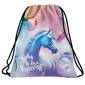 A látványos, fényes felületű, egyszarvús iskolatáska szett része az iskolatáska, a kihajtható tolltartó és a tornazsák.